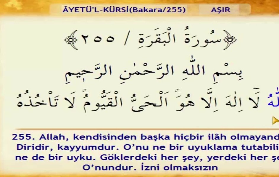 Ayet el kû rsi indiğinde dünyadaki bütün putlar ve krallar yere düşmüş ve başlarındaki taçları yuvarlanmıştır. O daima diridir hayydır bütün varlığın idaresini yürüten kayyum dir. Ayetel kürsi namaz içinde sure şeklinde okunduğu gibi namazda tesbihden önce de okunur. Ayetel kürsi bakara suresinin 255.